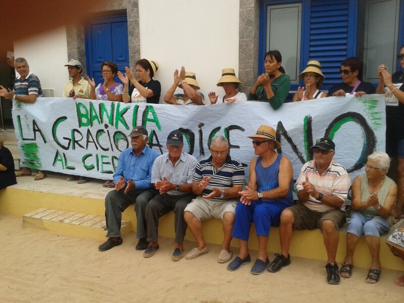 Los gracioseros se postraron a las 11 horas ante la sede de la entidad bancaria en la octava isla, ubicada en la calle La Tegala de Caleta de Sebo, con una gran pancarta que rezaba “La graciosa dice no al cierre de Bankia”.