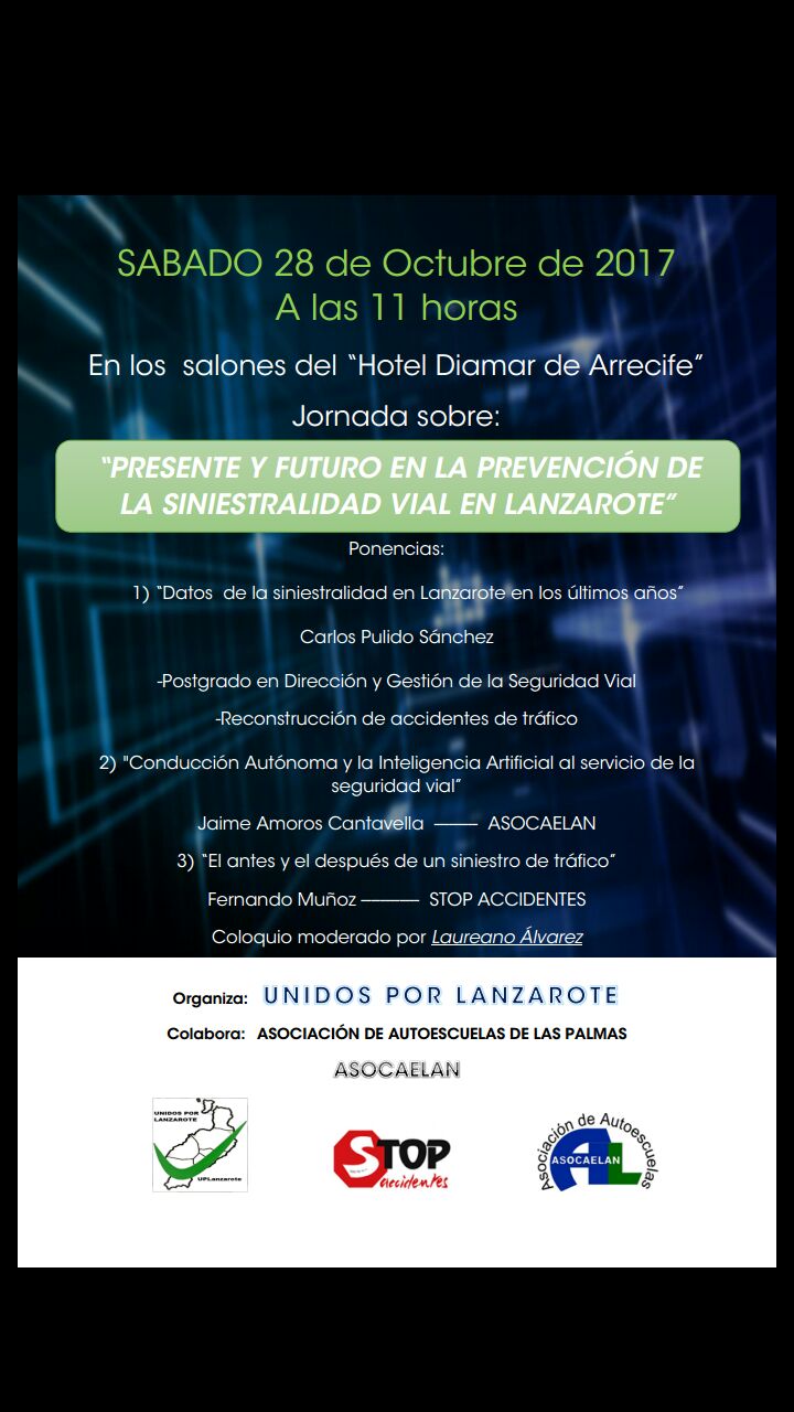 Unidos por Lanzarote organiza unas jornadas sobre seguridad vial que llevan por nombre "El presente y el futuro sobre la siniestralidad vial en Lanzarote". Se celebrarán este sábado 28 de octubre a las 11.00 horas en el hotel Diamar de Arrecife.