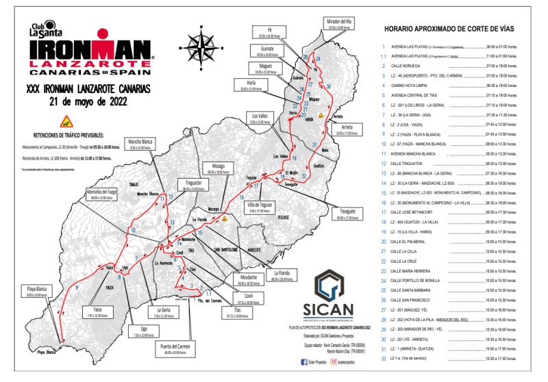 Sirva como guía principal el plano diseñado hace días por el Plan de Seguridad del XXX IRONMAN Lanzarote Canarias Triatlón, un dibujo detallado en el que aparecen las principales carreteras, avenidas y calles afectadas por el desarrollo del tramo ciclista, un reto que llevará a los participantes a transitar por 180 kilómetros de la red insular, con el consiguiente impacto en el tráfico rodado.