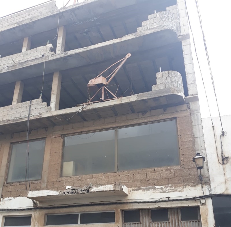 ¡Menudo peligro! es el pie de foto que nos envía un lector de LANCELOT DIGITAL junto con la foto que ilustra esta información para denunciar la situación de la máquina que unos obreros han dejado peligrosamente colocada en un edificio en construcción de la calle Portugal, en la paralela con la calle Triana de Arrecife.