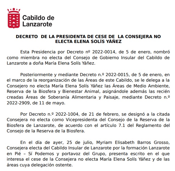 Los consejeros de Podemos en el Cabildo de Lanzarote complacieron a Dolores Corujo, quien les solicitó el lunes que Elena Solís abandonara la Consejería de Medioambiente, donde fue nombrada en su día como un gran fichaje del partido morado.