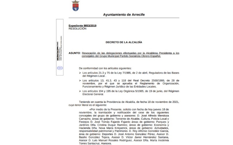 Vea aquí el decreto en que los concejales y asesores socialistas dejan de formar parte del grupo de gobierno.