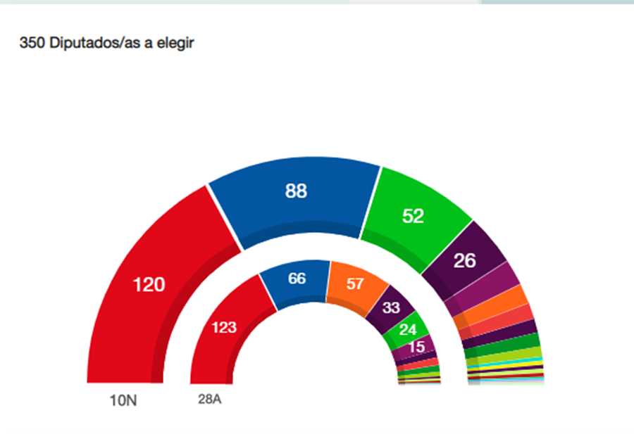 Vox experimenta un enorme ascenso que duplica su representación en el Congreso, con 52 escaños frente a los 24 de los anteriores comicios, el PP sube hasta los 88 cuando tenía 66 representantes, y Ciudadanos sufre una debacle aún mayor que la pronosticada por las encuestas, al bajar de 57 a tan solo 10 escaños.