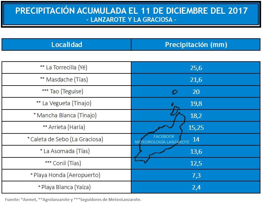 Por otro lado se registraron en en la granja del Cabildo 11,3 litros; en El Mojón 18,5 litros; en Teseguite 21 litros; yJameos del Agua 17 litros. Aunque la palma se llevan Soo con 23,3 litros.