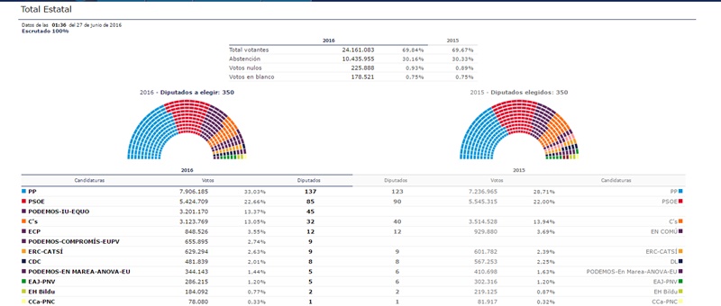 El PP no sólo ha vuelto a ganar las elecciones en España, sino que ha mejorado sus resultados con un 33,03% de los votos y 137 escaños, 14 más que en las elecciones anteriores. Los populares se han impuesto en prácticamente todas las comunidades del país, a excepción de en Cataluña y el País Vasco. En Andalucía, sólo no ha ganado en las provincias de Sevilla, Huelva y Jaen. Aun así, el panorama político que deja este 26-J sigue generando incertidumbre, puesto que el PP ha quedado lejos de la mayoría absoluta y no ha habido grandes cambios en el mapa político "137 diputados es un resultado extraordinario. Sabíamos ya en campaña que los resultados iban a ser mucho mejores", señalaba a presidenta del PP en Lanzarote, Ástrid Pérez.