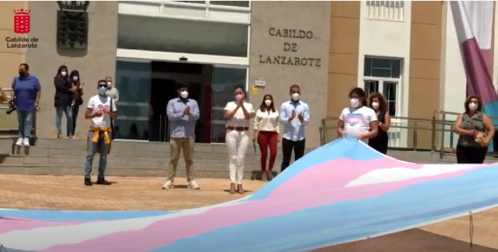Una gran bandera Trans ocupó gran parte de la explanada que se encuentra enfrente del Cabildo de Lanzarote este jueves. Dolores Corujo, presidió un acto para reivindicar la lucha del colectivo LGTBI y poner en valor la lucha de esta comunidad.
