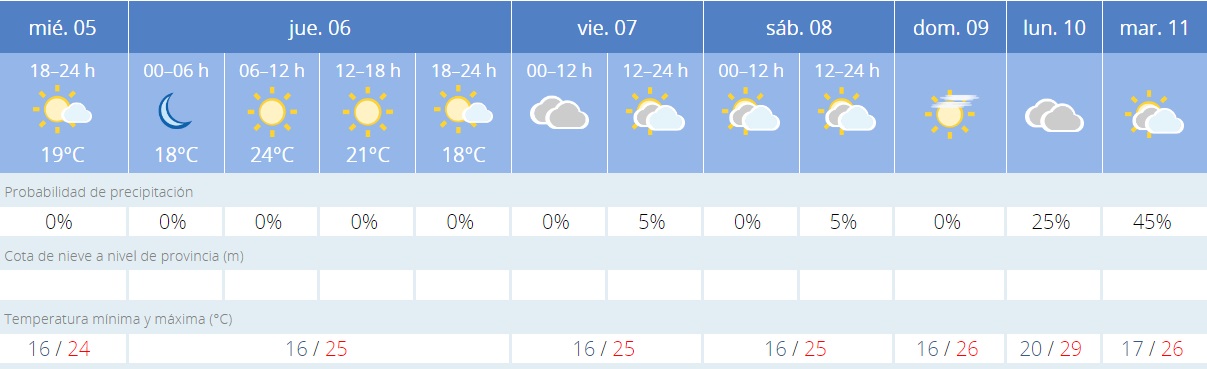 En cuanto a la climatología, durante el jueves el día, según las previsiones estará despejado, llegando ligeros intervalos nubosos a partir del viernes.