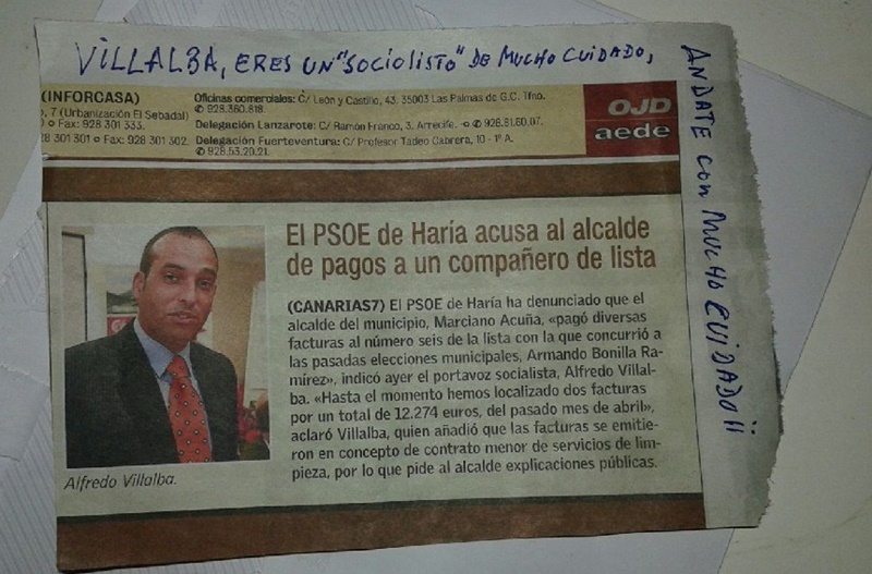 Según ha denunciado el edil, el pasado viernes llegó a las oficinas municipales de Haría un sobre a su nombre que contenía recortes de prensa referidos a su denuncia sobre. Sobre los recortes "se había escrito a mano un mensaje amenazante", asegura.