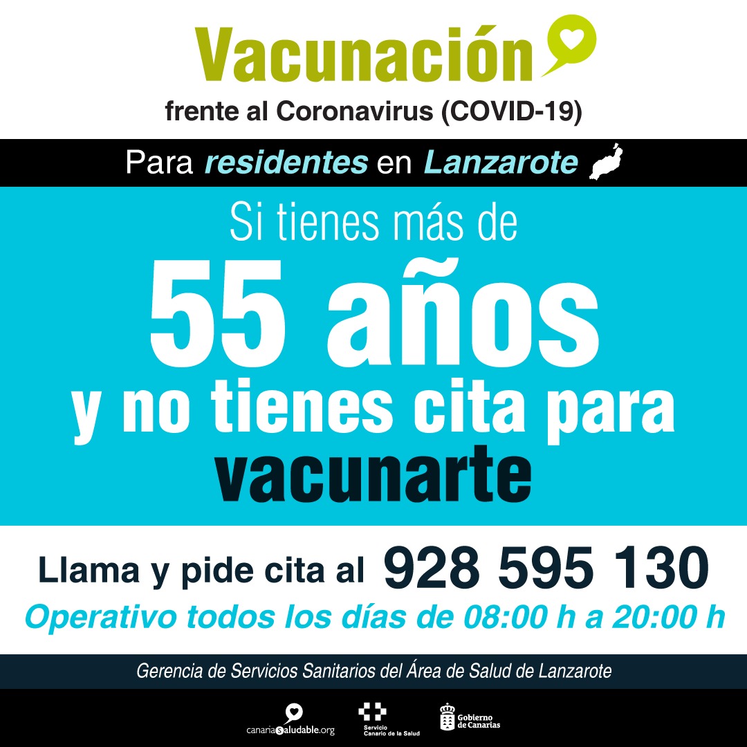 Además, de forma complementaria y para acelerar la vacunación en una parte de este grupo etario, las personas de más de 55 años residentes en Lanzarote que no hayan sido citados podrán llamar al 928 595 130 para pedir su cita previa.