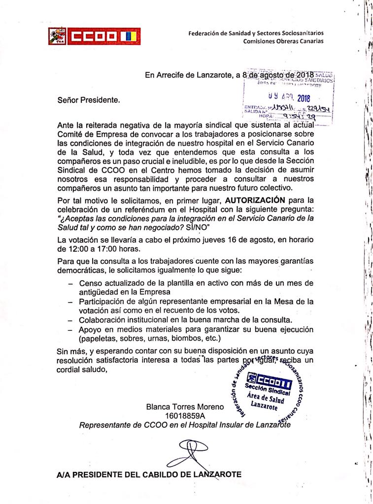 Comisiones Obreras se ha visto obligada a convocar a los trabajadores para votar las condiciones de integración del Hospital Insular (Cabildo de Lanzarote) en el Servicio Canario de Salud (Gobierno de Canarias), tal y como se acordó en la última reunión donde estuvo presente el presidente del Cabildo, Pedro San Ginés.