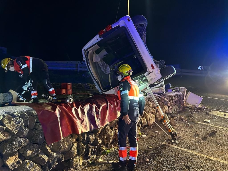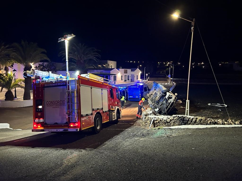 En la madrugada de este sábado, sobre las 02.30 horas, los bomberos del Consorcio tuvieron que actuar para excarcelar a un hombre tras un accidente a la altura del teleclub de Los Valles, en Teguise, al colisionar con un muro protector de la vía.