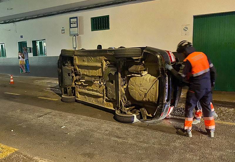 En la tarde del viernes, un accidente de tráfico en la calle Julio Romero de Torres, en Arrecife, dejó un coche volcado de forma lateral y daños en un vehículo que se encontraba estacionado en la zona. El conductor, que logró salir del vehículo por sus propios medios, fue atendido por los servicios sanitarios presentes en el lugar, confirmándose que no sufrió heridas graves.