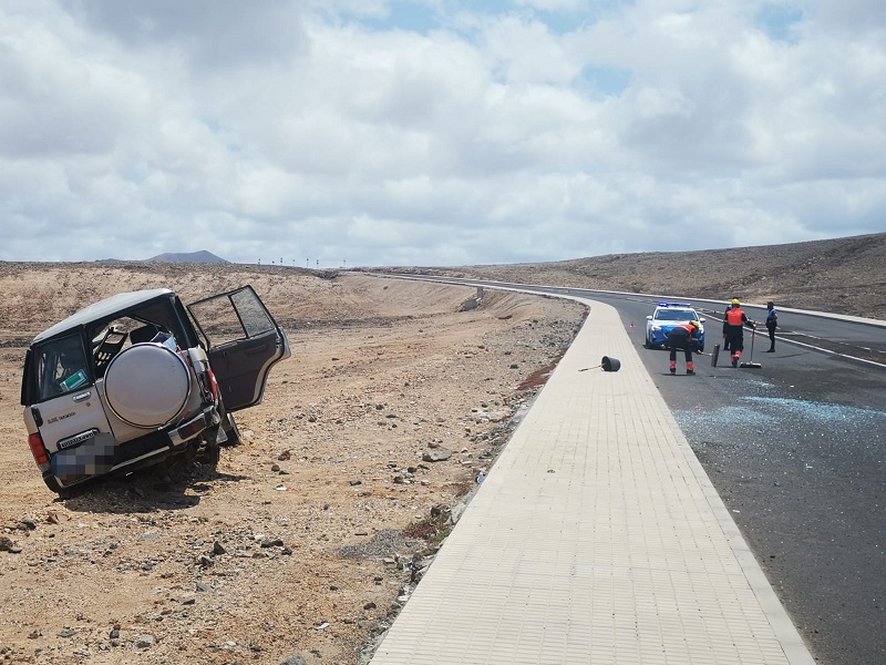 Accidente en el sur de Lanzarote en el que un vehículo acabó dando vueltas de campana. Un vuelco que en esta ocasión no tuvo más contratiempos que el susto. Ninguno de los cuatro ocupantes se quedó atrapado dentro del vehículo. El incidente se produjo en la zona de Montaña Roja en la Avenida Faro de Pechiguera.