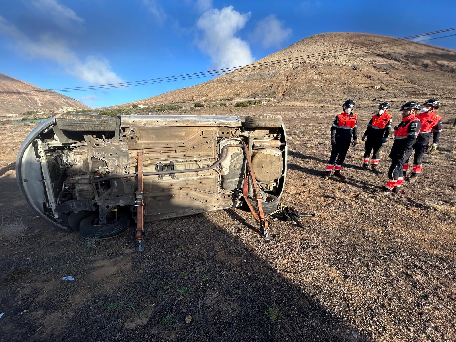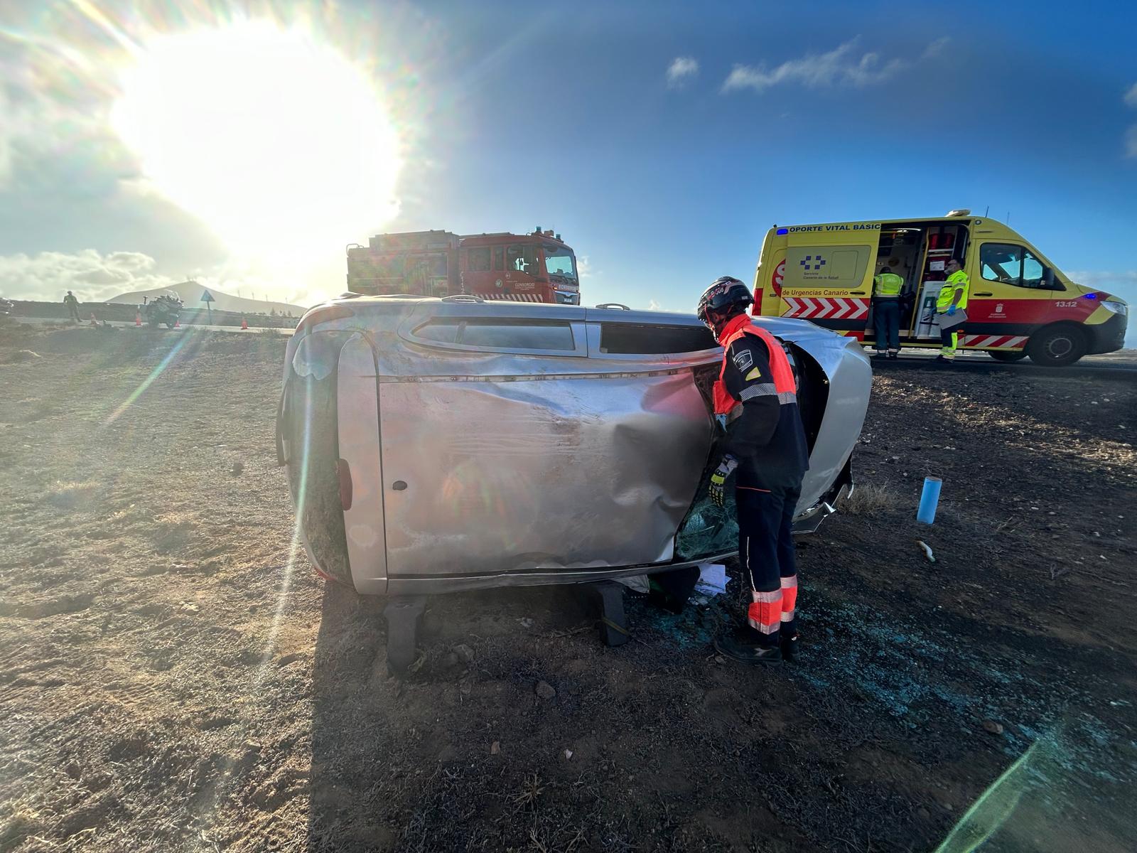 Un vehículo sufría un vuelco este jueves en la carretera LZ-35, entre Montaña Blanca y San Bartolomé. La conductora se quedó atrapada en su interior y no podía salir.
