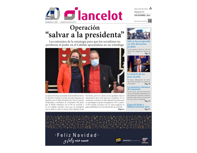 Un nuevo número del periódico Lancelot en papel está ya en la calle, el correspondiente a diciembre y llega, como cada mes, cargado de actualidad. La “Operación ‘salvar a la presidenta’”, en la que se narran los entresijos de la estrategia para que los socialistas no perdieran el poder en el Cabildo apoyándose en un tránsfuga como el consejero Juan Manuel Sosa, centra el reportaje principal que analiza también la ruptura de los pactos en Cabildo y Ayuntamiento capitalino y los nuevos acuerdos que se han formado. El turismo y la situación actual, así como la presencia de Lanzarote en la World Travel Market de Londres ocupan también páginas relevantes de esta edición. Lancelot rinde homenaje a Alexis Tejera, haciendo un recorrido de lo que ha supuesto para la isla como político. José De León, cuya tesis doctoral se centró en los pueblos sepultados por la lava durante las erupciones volcánicas de la isla, explica cómo era la isla antes de 1730 y como se transformó y nos asomamos a un auténtico museo marinero oculto tras el portón de un garaje en el barrio arrecifeño de Morro Angelito. Además, el deporte, la cultura, la gastronomía, los viajes y la opinión ocupan un espacio importante en el último periódico del año. En este número, además ofrecemos un Especial Moda y Belleza Invierno 2021.
