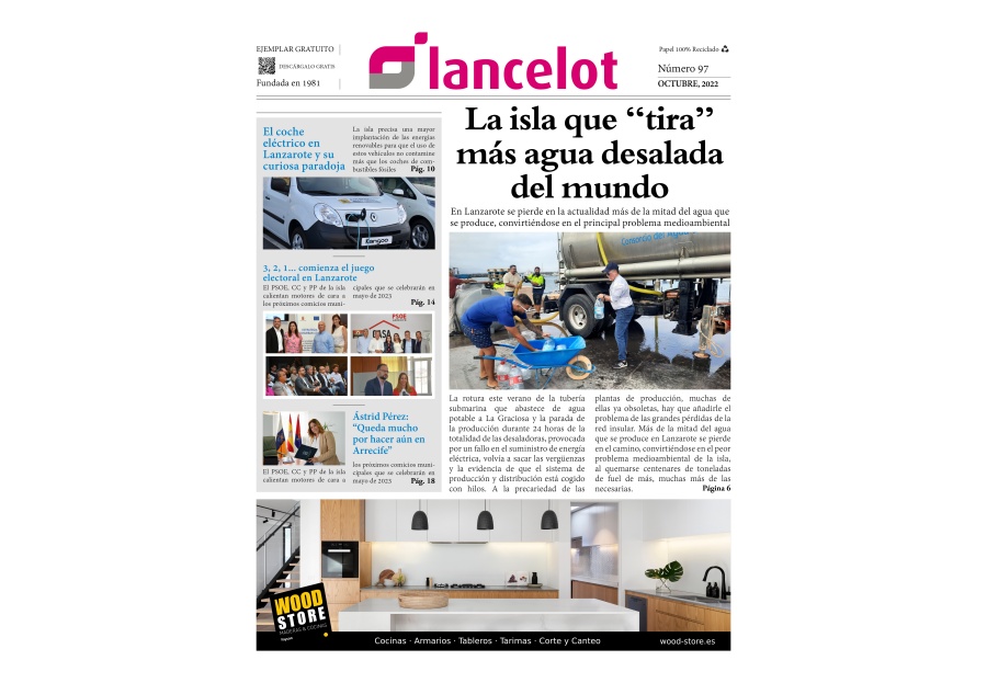 Un nuevo número del periódico en papel de Lancelot, el correspondiente al mes de octubre, está ya en la calle. En este número, el reportaje principal se centra en la gran cantidad de agua desalada que se pierde en Lanzarote. A la precariedad de las plantas de producción, muchas de ellas ya obsoletas, hay que añadirle el problema de las grandes pérdidas de la red insular. Más de la mitad del agua que se produce en Lanzarote se pierde en el camino, convirtiéndose en el peor problema medioambiental de la isla, al quemarse centenares de toneladas de fuel de más, muchas más de las necesarias. Además, analizamos la curiosa paradoja que se produce en la isla con los coches eléctricos y es que Lanzarote precisa de una mayor implantación de las energías renovables para que el uso de estos vehículos no contamine más que los coches de combustibles fósiles. Otro reportaje central pone el punto de mira en los partidos políticos y cómo comienzan a moverse de cara a los próximos comicios municipales que se celebrarán en mayo de 2023. Entrevistamos a la alcaldesa de Arrecife, Ástrid Pérez, que hace balance de su gestión política, habla de cómo han funcionado los pactos realizados y de los proyectos que se desarrollarán en los próximos meses en la capital.