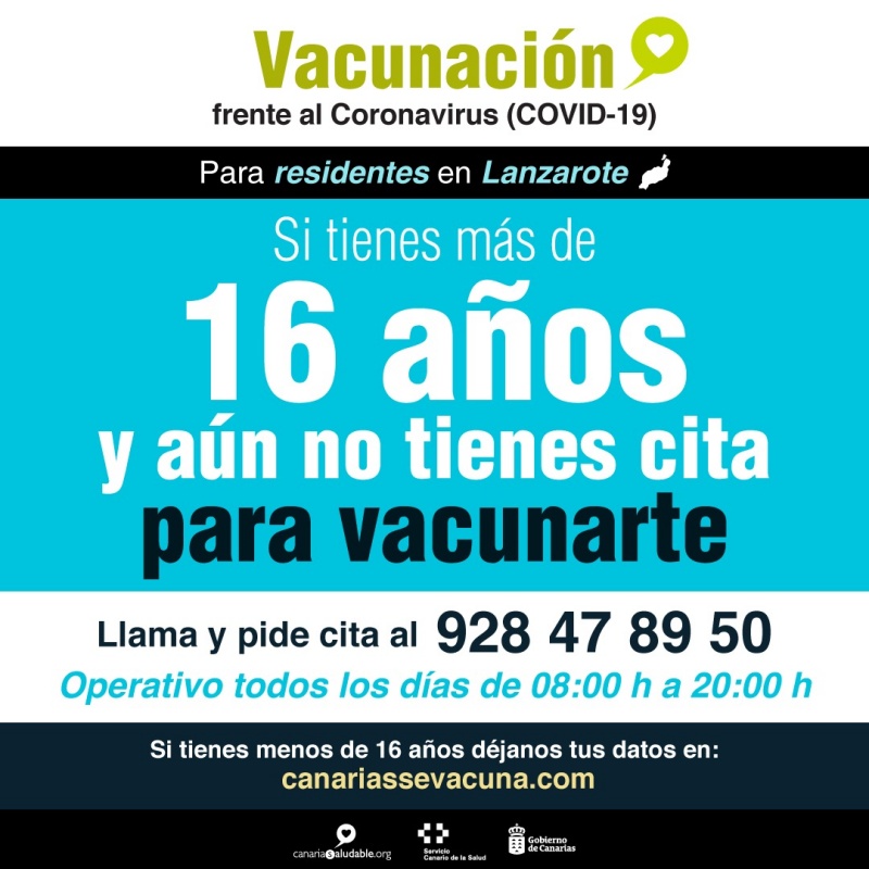 La Consejería de Sanidad del Gobierno de Canarias informa que los residentes en Lanzarote mayores de 16 años que aún no hayan solicitado cita para la primera dosis de la vacuna pueden hacerlo desde hoy llamando al teléfono 928 47 89 50, operativo de lunes a domingo de 08:00 horas a 20:00 horas.