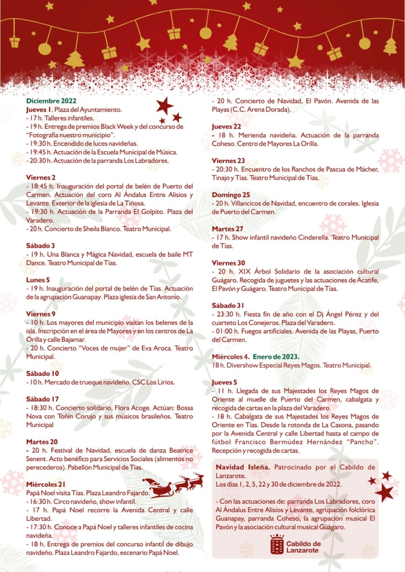 Para despedir el año, el sábado, 31 de diciembre, a partir de las 23 horas, Teguise celebrará una fiesta de fin de año con verbena amenizada por las orquestas "Sintonía Show" y "Banda Nueva", y con campanadas cotillón, uvas de la suerte y fuegos artificiales desde la plaza de los Leones de la Villa de Teguise. Por su parte, la isla de La Graciosa también se despedirá de 2022 con actividades infantiles, reparto de truchas, campeonato de fútbol, cine de Navidad, gala familiar y fuegos artificiales y verbena con "Rica Banda" para la noche de Fin de Año.