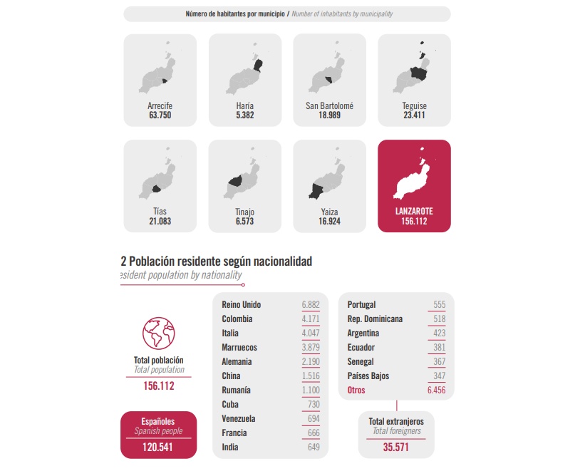 En lo que se refiere al reparto por municipio, de esa población, 63.750 personas viven en Arrecife; 23.411, en Teguise; 21.083, viven en Tías; 18.989 viven en San Bartolomé; en Yaiza residen 16.924 personas; el sexto municipio por orden de población es Tinajo, con 6.573 personas; y en último lugar se sitúa Haría, donde viven 5.382 personas.
