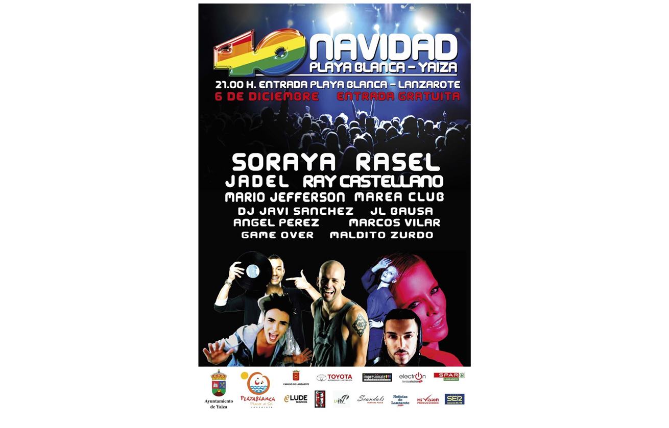 Las fiestas de fin de año llegan temprano a Playa Blanca de la mano del concierto Navidad 40 Playa Blanca, un encuentro musical para el disfrute gratuito de vecinos y visitantes que presenta en su cartel, entre otros artistas, a los cantantes Soraya y Rasel y al Dj canario por excelencia, Ray Castellano. El concierto organizado por el Ayuntamiento de Yaiza y Los 40 Principales será el viernes 6 de diciembre, a las 21:00 horas, en la trasera de la Estación de Guaguas del primer núcleo turístico de Lanzarote.