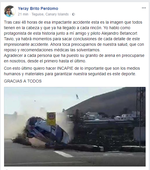 Yeray Brito, el joven copiloto, se recupera favorablemente del accidente que sufrió durante la celebración del Rally Orvecame Isla de Lanzarote que se celebró este sábado 2 de diciembre, cuando su coche sufrió un impacto delantero y dio varias vueltas de campana en el cruce conocido como Cuatro Caminos en Masdache.
