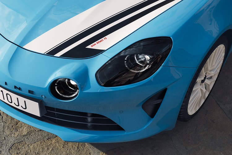 Con su nueva carrocería en el color original Caddy Blue, arcos de techo negros y techo de carbono rojo, la serie limitada A110 San Remo 73 reinterpreta la legendaria decoración de la histórica berlina de 1973. La firma « San Remo 73 » en el capó, las puertas y el parachoques trasero se complementa con gráficos en blanco y negro en las puertas. Todo ello se adereza con llantas Grand Prix de 18 pulgadas en blanco y elementos pintados en negro, como las pinzas de freno Brembo, el interior de los faros delanteros y los logotipos y monogramas Alpine.