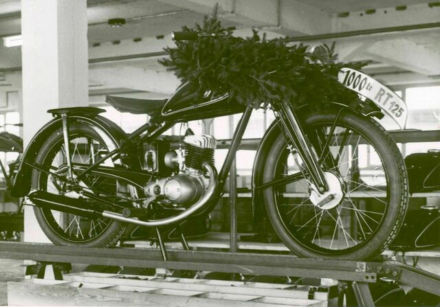 En noviembre de 1949, le siguió un segundo vehículo: la DKW RT 125. La motocicleta supuso una importante contribución a la movilidad asequible en la Alemania de posguerra. Pero la RT 125 también era una ‘vieja amiga’, ya que había sido desarrollada en 1939 en la fábrica de DKW en Zschopau y construida durante la guerra para la exportación y las fuerzas armadas alemanas. Tras la Segunda Guerra Mundial, la producción del modelo se reanudó en la fábrica de motocicletas de Zschopau (Sajonia, Alemania del Este), ahora de propiedad estatal, con el nombre de IFA (Industrieverwaltung Fahrzeugbau) RT 125. Al modelo de Ingolstadt se le añadió una «W» para identificarlo como producto de Alemania Occidental. Aparte del depósito ligeramente redondeado, la RT 125 era casi idéntica al modelo de antes de la guerra, con su horquilla trapezoidal, suspensión de bandas de goma, motor de dos tiempos de 4,75 CV y transmisión de tres velocidades accionada con el pie.