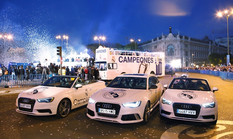 Tres automóviles Audi, un Audi RS 6 Avant y dos Audi A3 Cabrio, todos ellos de color blanco y decorados con el escudo del equipo, escoltaron a la guagua que trasladó a los jugadores del Real Madrid en la celebración de la victoria en la UEFA Champions League 2013-2014 en su recorrido por las calles madrileñas hasta la Plaza de Cibeles, donde los jugadores cumplieron con la tradición y celebraron el título ofreciendo la copa a los aficionados que se dieron cita para recibir a su equipo.