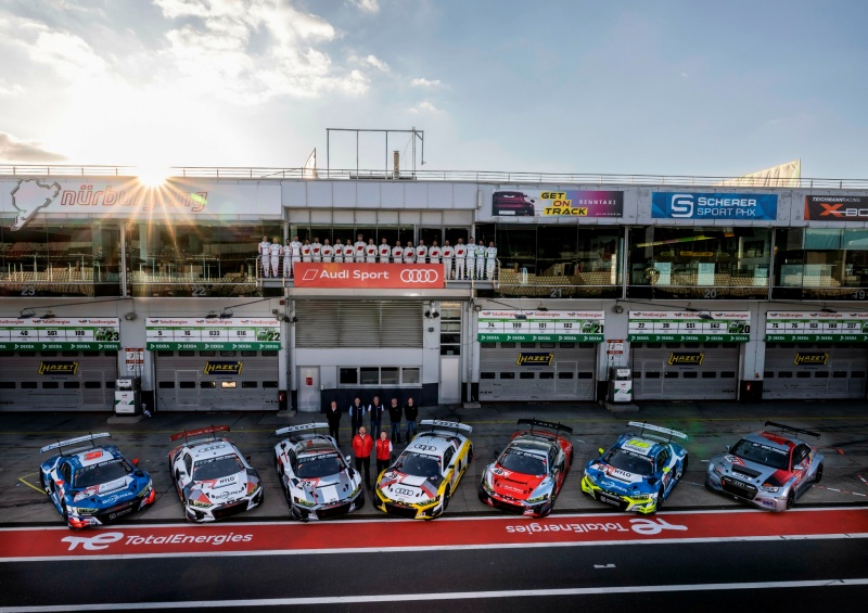 Seis semanas después de su aparición en Nürburgring, Audi continuó con el tema de diseño "Pasado, Presente y Futuro" con nuevos diseños de libreas en las 24 Horas de Spa 2023. Los coches R8 LMS también fueron protagonistas en Bélgica por sus resultados en pista: Audi ganó el prestigioso trofeo "Coupe du Roi" como mejor fabricante de la carrera, que es la mayor carrera de GT3 del mundo y tiene lugar en el famoso circuito Grand Prix de Spa. En el Día de la Familia, celebrado en Böllinger Höfe el 8 de julio, decenas de miles de personas experimentaron Audi Sport GmbH como una parte particularmente dinámica de la marca de los cuatro aros, lo que incluyó, por ejemplo, dar paseos en el coche de carreras Audi R8 LMS y el RS Q e-tron prototipo para el Rally Dakar.