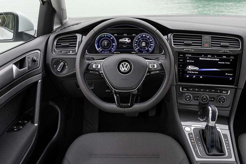 De igual modo que el exterior, el interior del e-Golf también se ha perfeccionado y personalizado, creando un nuevo mundo de indicación y manejo digitalizado. El e-Golf se caracteriza por un equipamiento de serie especialmente amplio, como el nuevo sistema superior de infotainment Discover Pro con control gestual y control por voz. Su pantalla de 9,2 pulgadas diseñada sin teclas, forma una unidad conceptual y visual con el Volkswagen Digital Cockpit, también nuevo en el modelo, y que sustituye los instrumentos analógicos. Otros de los rasgos característicos del vehículo eléctrico son los instrumentos adaptados a la propulsión eléctrica.