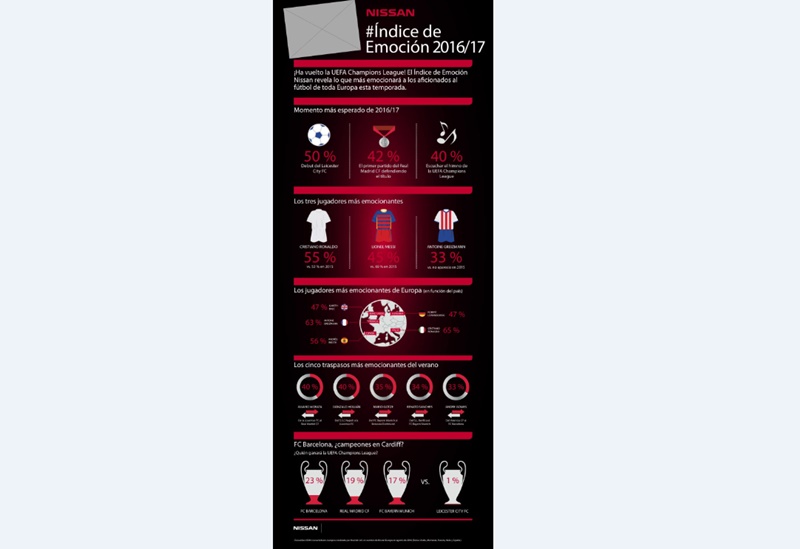 Tras los resultados del Índice de Emoción Nissan 2015-2016, que indicaban que los europeos se emocionan más con el fútbol que con el sexo, la investigación realizada antes de la nueva temporada indica que ganar la UEFA Champions League resulta más emocionante (29 %) que comprometerse en matrimonio (16 %), graduarse en la universidad (24 %) o conseguir un ascenso o un aumento en el trabajo (21 %). Más significativo si cabe, en este índice de la emoción destaca el hecho de que uno de cada 10 europeos afirma que se perdería el nacimiento de su propio hijo si pudiera asistir a un partido de la UEFA Champions League.