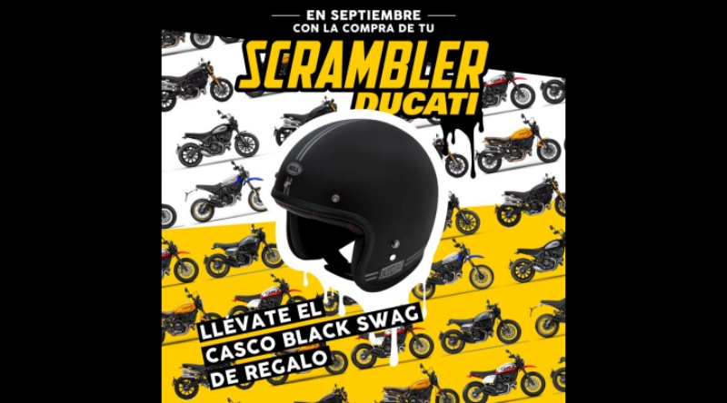 ¡Tú eliges el modelo y nosotros te ponemos el casco! ¡No dejes escapar una oportunidad única! Aprovecha y llévate tu Scrambler favorita con el complemento perfecto gratis, el casco Black Swag.
