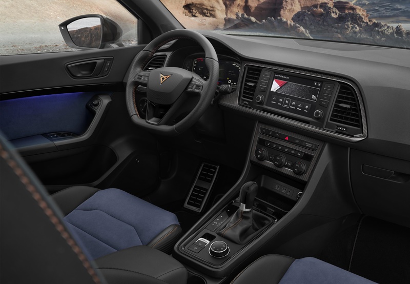 El conductor percibe la exclusividad incluso en las llaves del vehículo, que disponen de una carcasa de fibra de carbono de CUPRA. Además, en el interior encontramos unos asientos delanteros de tipo bucket, con tapicería en tejido Alcántara de color Azul Petrol, material y tono también presentes en los asientos traseros y en los paneles de las puertas, que añade un atractivo visual nunca visto en el CUPRA Ateca.
