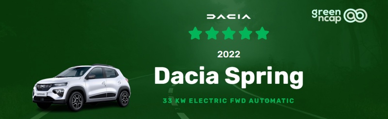 Dacia Spring obtuvo la máxima puntuación -único modelo en conseguirlo- en dos de los tres apartados analizados por Green NCAP: el índice de aire limpio y el índice de gases de efecto invernadero. En el tercer y último apartado, el índice de eficiencia energética, su resultado fue de un 9,8, puntos; nunca alcanzada por ningún otro modelo. Dacia Spring recibió una puntuación global de 9,9, lo que le otorga el primer puesto de la clasificación.