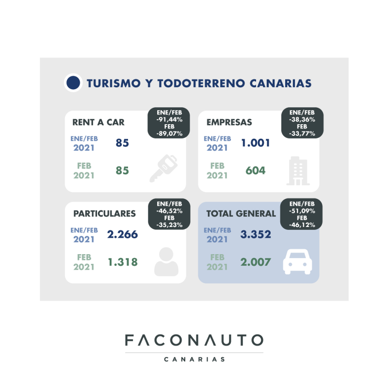 El pasado mes de febrero se matricularon en Canarias 2.007 turismos y todoterrenos, lo que representa un descenso del 46,1%, con respecto a febrero de 2020. En estos primeros dos meses se han vendido 3.352 vehículos de este segmento, lo que supone un 51% de caía acumulada.