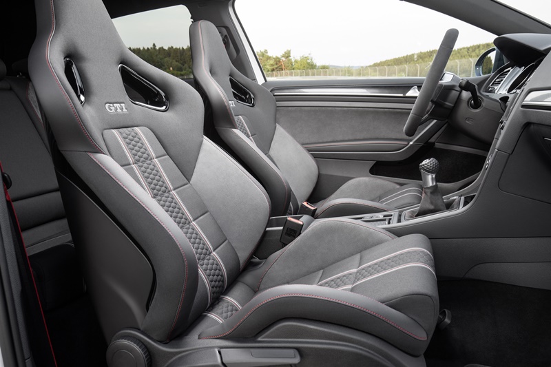 En cuanto al interior, Volkswagen ha querido trasladar al conductor al mundo de la competición a través de algunos elementos como el volante deportivo, los asientos ergonómicos con diseño hecho a medida, la tapicería en tela de tartán, las costuras en rojo, el pomo del cambio de marchas en forma de bola de golf y la línea de techo de color negro. Estas insignias de deportividad han sido personalizadas o modificadas para el Golf GTI Clubsport. Así pues, este nuevo modelo conmemorativo presenta asientos individuales de competición abatibles en lugar de asientos deportivos. Estos están parcialmente cubiertos con Alcántara y lucen un diseño de nido de abeja en la zona del respaldo y el acolchado; en el respaldo, también aparece la inscripción “GTI”. Los cinturones de seguridad quedan resaltados por una línea roja. Por su parte, nuevas franjas decorativas en diseño “Honeycomb 40” (en los instrumentos, la consola central y las puertas) dan al interior una imagen todavía más exclusiva. Cuando el conductor y el acompañante abren las puertas, ven las exclusivas placas protectoras de acero inoxidable en los umbrales de las puertas, que también incluyen la inscripción “GTI” en rojo.