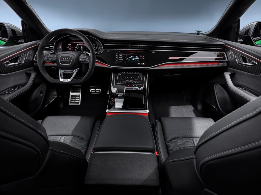 El conductor puede influir de manera precisa en el carácter del RS Q8 mediante el sistema de conducción dinámica Audi drive select. Existen ocho modos a elegir: comfort, auto, dynamic, efficiency, allroad, offroad y los dos modos RS individualmente configurables (RS1 y RS2), que se pueden activar directamente mediante el botón “RS-Mode” situado en el volante. El Audi drive select gestiona elementos como el motor, la transmisión, la dirección, la suspensión, el sonido del escape o la climatización.