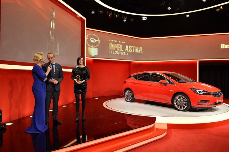 Y el ganador es: El Opel Astra. La nueva estrella de la clase compacta de Opel, fue reconocida en los Oscar de la industria del automóvil en Berlín y ganó el “Volante de Oro”. El Astra, que acaba de llegar a los concesionarios a mediados de octubre, está cosechando premios. El presidente y consejero delegado del grupo Opel, Dr. Karl-Thomas Neumann y la directora general de Marketing, Tina Müller, asistieron a la ceremonia en la Axel-Springer-Haus, donde recibieron el premio de manos de los editores Marion Horn (Bild am Sonntag) y Bernd Wieland (Auto Bild). El “Volante de Oro” se entrega por las dos publicaciones. El jurado, formado por lectores, expertos y experimentados pilotos, que tras extensas pruebas de conducción, eligen mejores nuevos modelos del año.