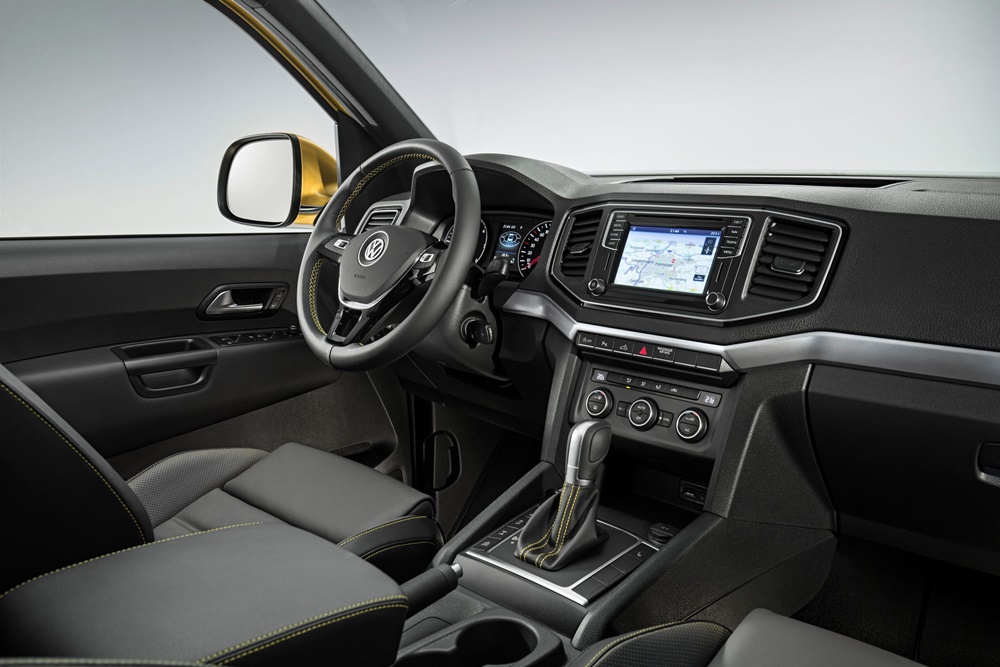El Amarok Aventura Exclusive muestra el camino a seguir en el futuro del segmento pick-up. Una propuesta con más caballos y con más par motor. La caja de cambios automática tiene ocho velocidades y una tracción permanente a las cuatro ruedas con un motor más potente de 258 CV. Con esto se asegura una potencia suficiente para remolcar y acelerar. El modelo elegido para la presentación en el Salón de Frankfurt ha sido un doble cabina de color amarillo cúrcuma metalizado con unas llantas de aleación Milford de 19 pulgadas que se combina de forma perfecta con detalles cromados en los estribos, la barra antivuelco, la parrilla de protección delantera, los retrovisores exteriores y el parachoques trasero. Los faros bi-xenón con luces diurnas LED le proporciona también una apariencia deportiva.