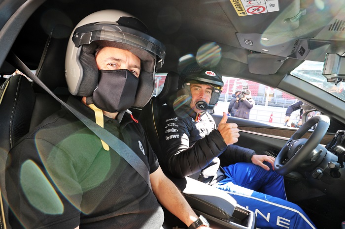 Juntos rodaron en el circuito intercambiando sus primeras impresiones del vehículo del que Alonso destacó su eficiente diseño aerodinámico, su frenada y su alto grado de insonorización, a la vez que se sorprendió del alto grado tecnológico de este modelo, especialmente con su nuevo sistema multimedia OpenR Enlace, desarrollado con Google.
