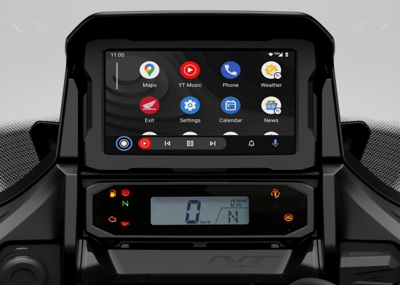 El completo paquete electrónico de la NT1100 incluye 3 modos de conducción por defecto (Urban, Rain y Tour) además de 2 modos User personalizables, 3 niveles de Control de Par Seleccionable Honda (HSTC) y 3 niveles de Control Antiwheelie. Una pantalla TFT táctil de 6,5 pulgadas proporciona visualizaciones personalizables a todo color y ofrece Apple CarPlay, Android Auto y conectividad Bluetooth.