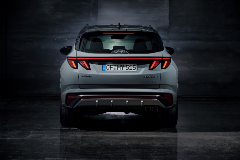 Para enfatizar el aspecto deportivo del vehículo en la parte trasera, el Nuevo TUCSON N Line está equipado con un spoiler aerodinámico más largo que el modelo estándar y rematado con aletas. La parte inferior de la zaga está acentuada por una banda reflectante roja y un difusor. Por su parte, los agresivos tubos de escape dobles subrayan el hecho de que los diseñadores han tomado muchas referencias del mundo de los coches de alto rendimiento.