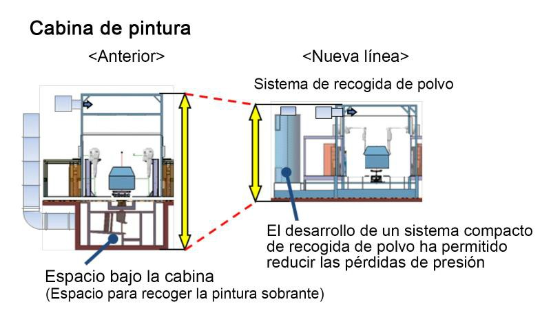 Se han aplicado nuevas medidas como la reducción del espacio bajo la cabina de pintura, allí donde se recoge la pintura sobrante, la creación de un compartimento de suministro de aire de la cabina más estrecho¹, aplicación de jidoka —automatización con un toque humano— de los procesos de limpieza y pintura interior², la mejora de las capacidades de procesamiento robótico, la optimización del paso de transferencia, la disminución del área de sección del horno seco y el uso efectivo de equipamiento de desodorización más compacto.