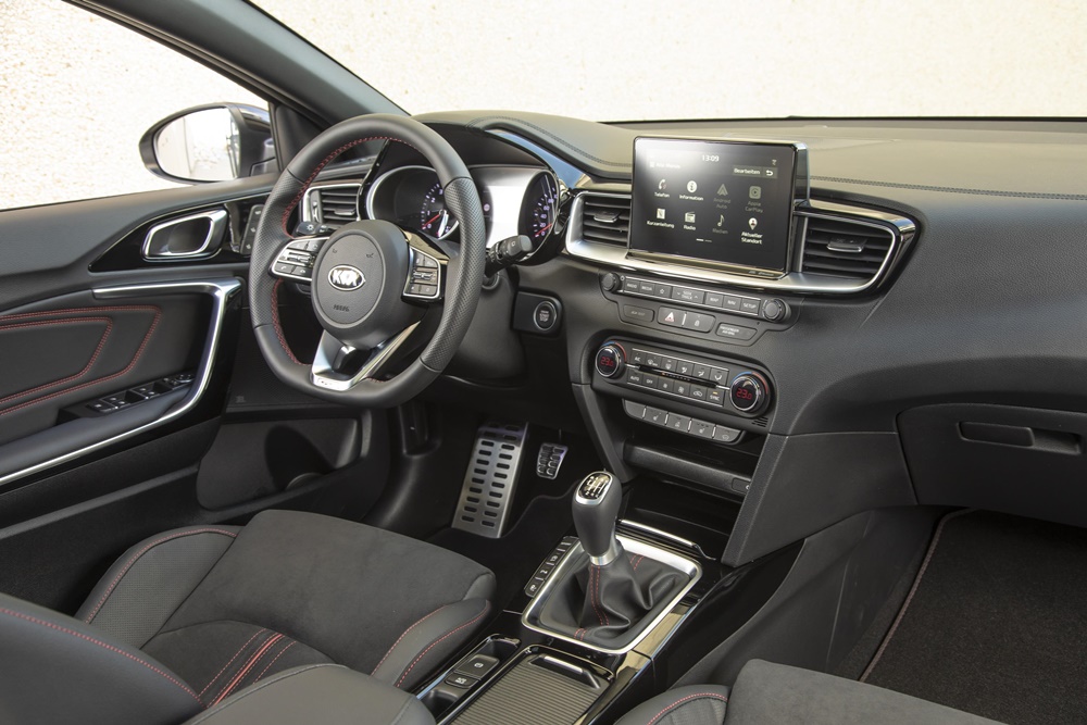 Esta versión ha sido desarrollada a partir de la ergonómica arquitectura interior de la gama Ceed. Las superficies están acabadas con materiales de tacto suave de alta calidad y con molduras metálicas, mientras que el salpicadero, ligeramente orientado hacia el conductor, facilita el manejo durante la marcha. En el centro del salpicadero está el sistema de infoentretenimiento de Kia con pantalla “flotante”, 8 pulgadas (20 cm), con los controles de audio, ventilación y calefacción situados por debajo.
