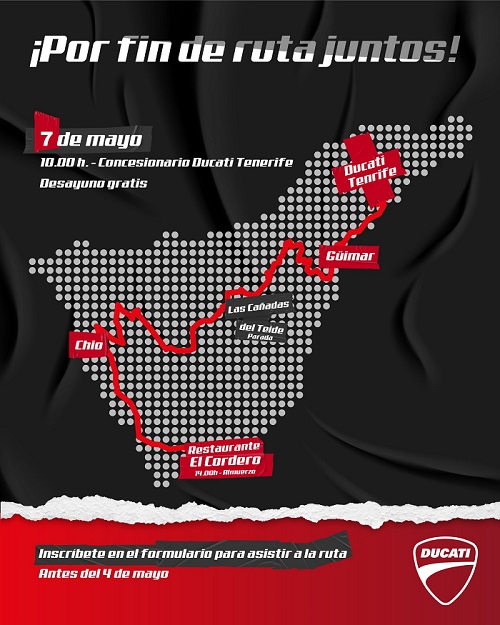 Como viene siendo habitual, la ruta está abierta a cualquier ducatista. Todos los interesados en disfrutar de esta experiencia Ducati y volver a compartir un día en familia ya pueden inscribirse en el siguiente enlace: https://bit.ly/RutaDucatiTF