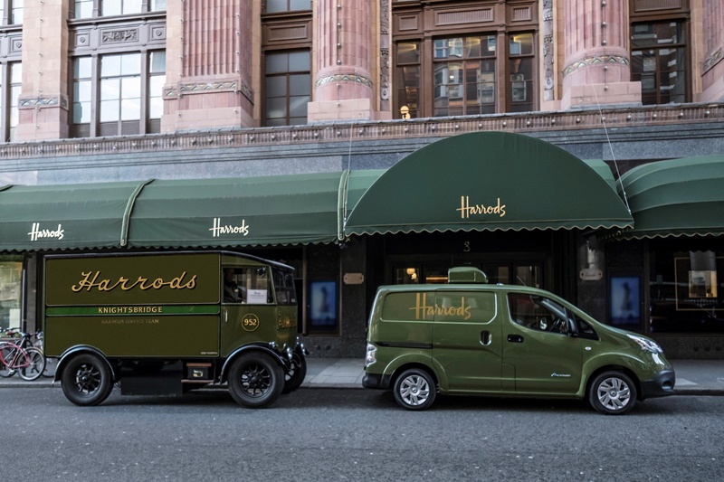 En 1919, estos grandes almacenes usaban furgonetas eléctricas American Walker con neumáticos macizos, aunque posteriormente pasaron a crear su propia flota de 60 vehículos eléctricos para repartir productos a sus clientes londinenses. Cuando los motores de gasolina ganaron en popularidad, las furgonetas eléctricas fueron gradualmente abandonadas. Sin embargo, con la introducción y el desarrollo de nuevas infraestructuras y tecnologías, Nissan ha permitido a Harrods volver a contar con una furgoneta eléctrica en su flota.