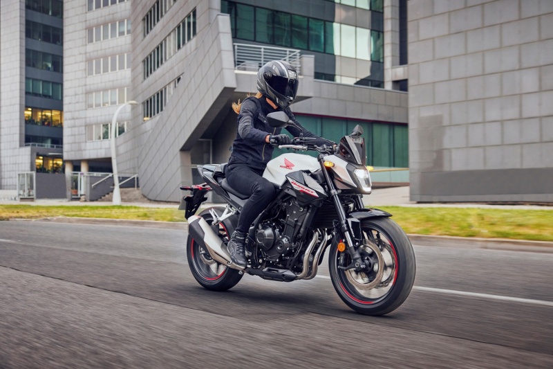 La potencia y el par del motor de 471cc cumplen los requisitos máximos para el carnet A2 (con 35kW y 43Nm), mientras que los reglajes actualizados de la inyección mejoran el tacto de la aceleración desde bajo régimen, y la CB500 Hornet incorpora ahora control de tracción HSTC para una mayor seguridad.