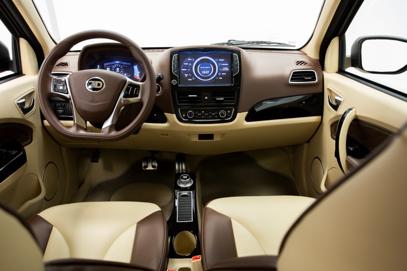 Un modelo que sobresale tanto por la calidad de sus acabados como por su amplio equipamiento de serie, con: tapicería en símil piel con diferentes combinaciones de color, sistema de infoentretenimiento con pantalla táctil a color de 9”, cámara de visión trasera, instrumentación digital, arranque por botón, aire acondicionado y sensores de aparcamiento. La pintura bicolor así como las distintas bandas decorativas de vinilo son las únicas opciones que contempla. Su garantía de 5 años o 100.000 km y la facilidad de poder cargar su batería por completo en cualquier toma doméstica en aproximadamente 6 horas aportan una gran confianza a los usuarios. Sin pasar por alto el aval que representa que su principal accionista sea Geely Motors, una de las grandes firmas de automoción en China propietaria de la sueca Volvo, de la británica Lotus y de los taxis ingleses Blackcab entre otros.