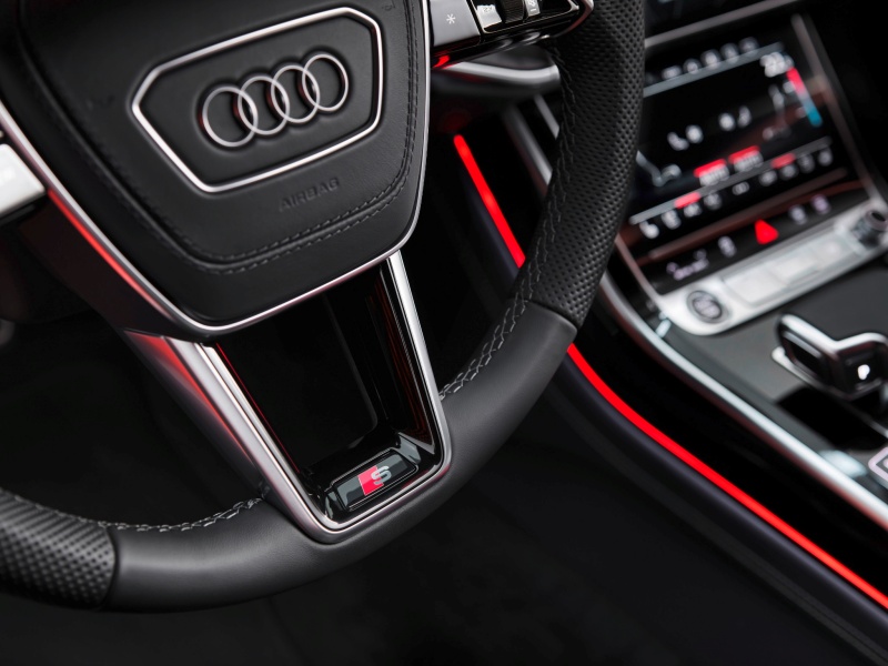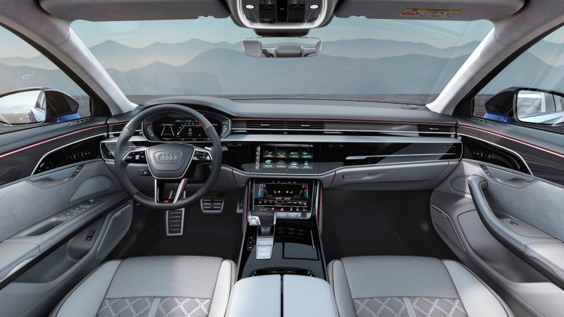 El acabado artesanal subraya el carácter y la gran manufactura del interior del A8, algo que se aprecia en las delicadas perforaciones de la tapicería de los asientos, los embellecedores del sistema de apertura y cierre eléctricos, las salidas de ventilación de las puertas o el cuero aterciopelado de los reposacabezas de confort. Los asientos están tapizados con cuero Valetta de serie. Como alternativa se ofrece cuero Valcona con la posibilidad de elegir el nuevo color Marrón Coñac. Otra novedad es el nuevo material de microfibra Dinamica, de producción sostenible, para los paneles de las puertas, que también se ofrece opcionalmente para el revestimiento del techo.
