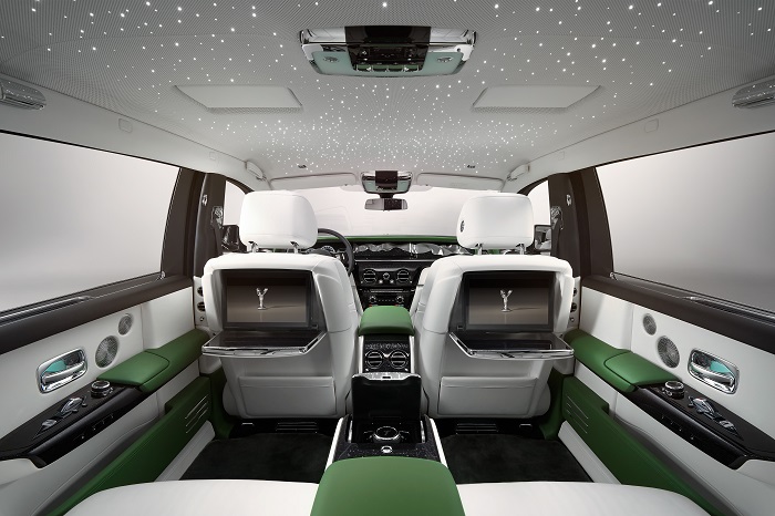 El lienzo más grande de Phantom es el Starlight Headliner. En un diseño único creado especialmente para Rolls-Royce Platino, las "estrellas" se colocan para atraer la atención hacia atrás, con caprichosas estrellas fugaces siguiendo el amplio arco del patrón.
